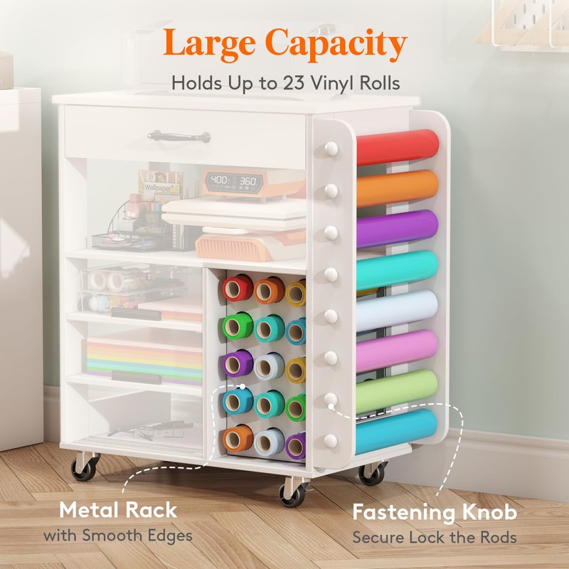 - All-In-One: Featuring multiple compartments including top and middle shelves with anti-fall fence for cutting machines and heat presses, a tool drawer, spaces for vinyl sheets, cardstock papers, and cutting mats, and areas for storing 23 vinyl rolls