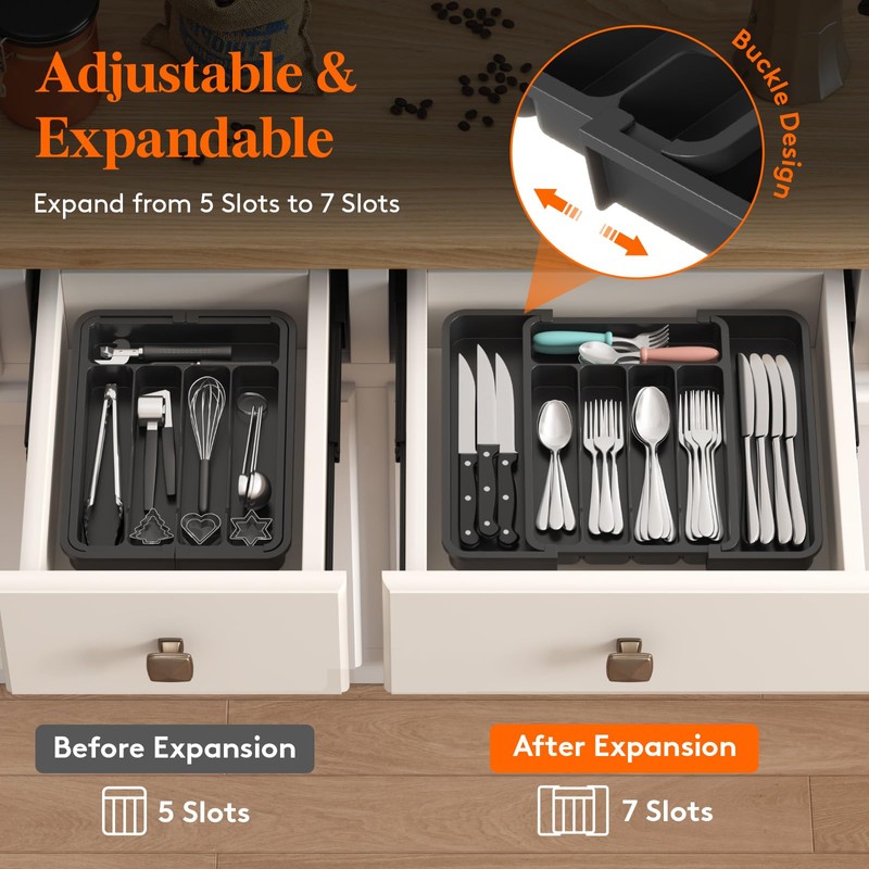 - Sort Your Silverware: Boasting 5 main compartments and 2 expandable layers this kitchen drawer organizer provides more space for your flatware, utensils, and other essentials. The expandable layers offer additional space when needed, making it a versatile and practical solution for organizing your drawers, maximizing your storage efficiency.