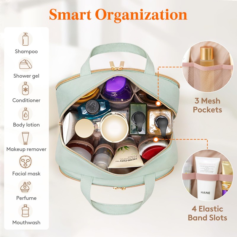 - Smart Organization: The main compartment of the travel essentials features mesh pockets and elastic bands to secure bottles, accommodating items like shampoo, conditioner, lotion, and perfume. The front pocket is perfect for organizing makeup brushes, mascara, eyeliners, and more