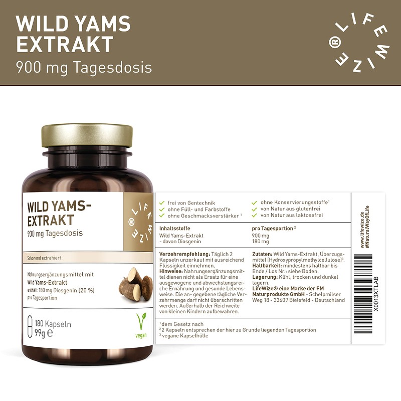LifeWize® Yam Root Capsules High Dose - 180 Wild Yams Capsules High Dose with 20% Diosgenin 900 mg per Daily Dose - Gently Extracted, Vegan & No Unnecessary Additives