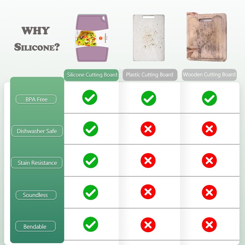 - 【HEALTHY &SAFE】: Certificated food safe Food-Grade Silicone. Heat resistant -40°F to 482°F(-40°C to 250°C) ,our silicone cutting boards and mats made from premium quality silicone is non-slip, heat proof and dishwasher safe.