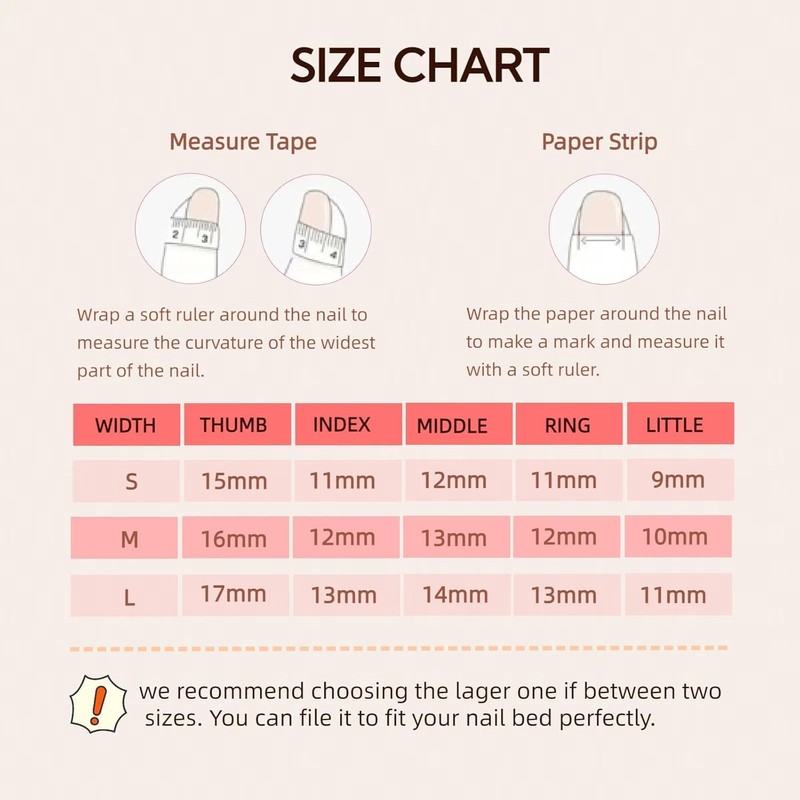 - 10 nail sizes ensure a totally custom fit, plus we give you everything needed just in case! Each set comes complete with adhesive tabs, double-sided nail file, cuticle stick, and prep pad.