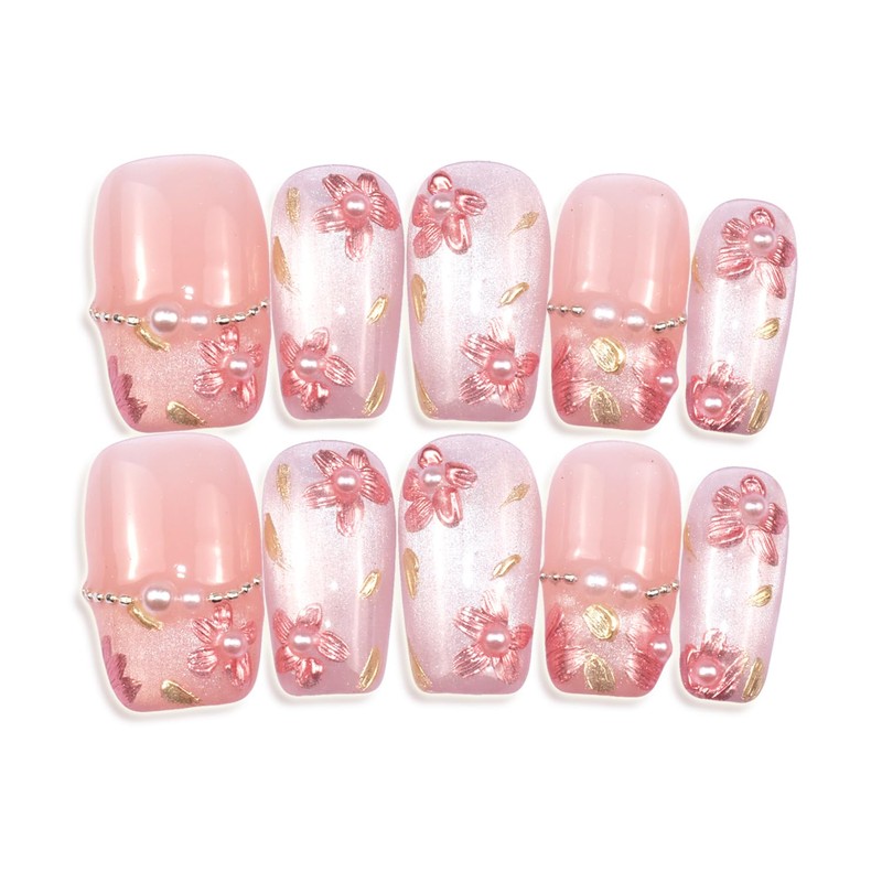 LIFOOST Handmade Nails Press On Medium Coffin Flowers Blooming French Style Cat Eye False Nail Tips with Pearls Design Stick On Nails for Autumn and Winter 10 Pcs, Size S