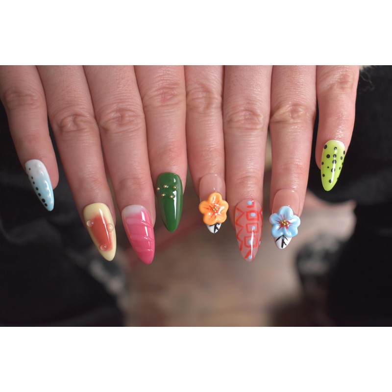 - Each piece of almond 3d nails with delicate 3D flowers and cherry for women is pure handmade and each piece has a unique design added to it.