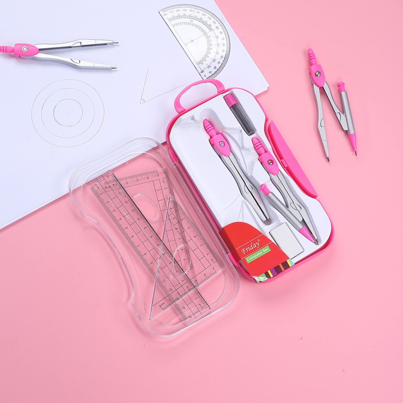 - Complete Geometry Kit: Our 10 Pcs Geometry Set meets all your drafting and drawing needs in one convenient package. Includes a precision compass, two rulers, a protractor, pencil, eraser, sharpener, lead refills, and a durable storage box. Perfect for students of all ages
