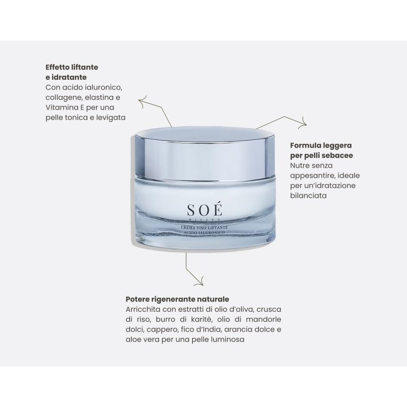 - - Lifting und langanhaltende feuchtigkeitsspendende Wirkung den ganzen Tag - Hyaluronsäure, Kollagen und Elastin - Made in Italy - Keine Parabene, Silikone und Paraffine hinzugefügt - Dermatologisch getestet