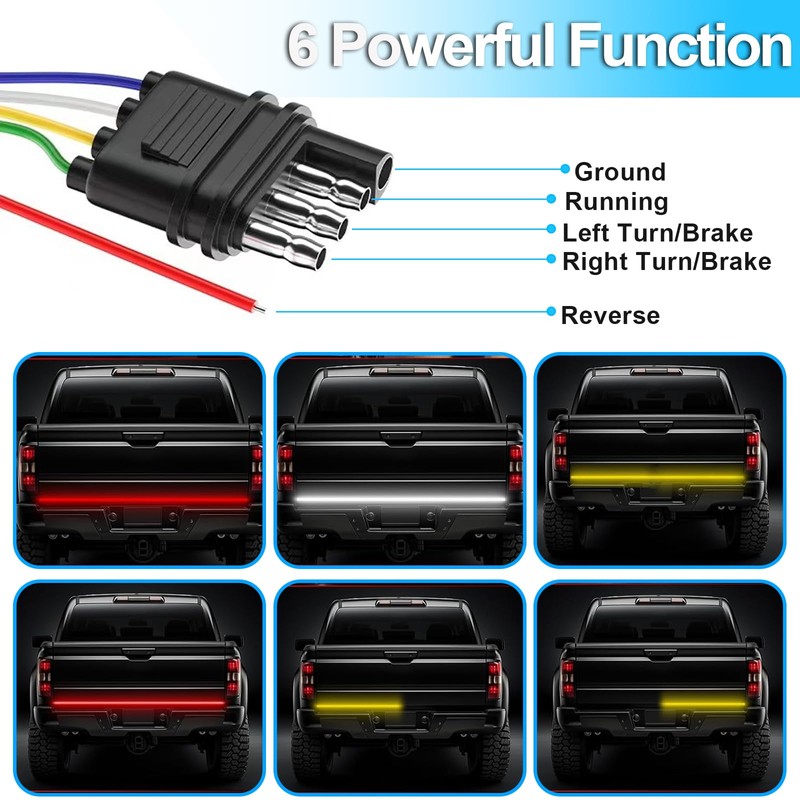 - 【6 Powerful Functions】Tailgate light strip has reverse light(White), brake Light(Bright Red), sequential right trun light(Right Amber), seguential left turn light(Left Amber), running light(Soft Red), sequential strobe light(Flashing Amber). This truck bed lights is an essential accessory that adds convenience and safety to your drive. Safely alert rear drivers to see you both on and off the road.