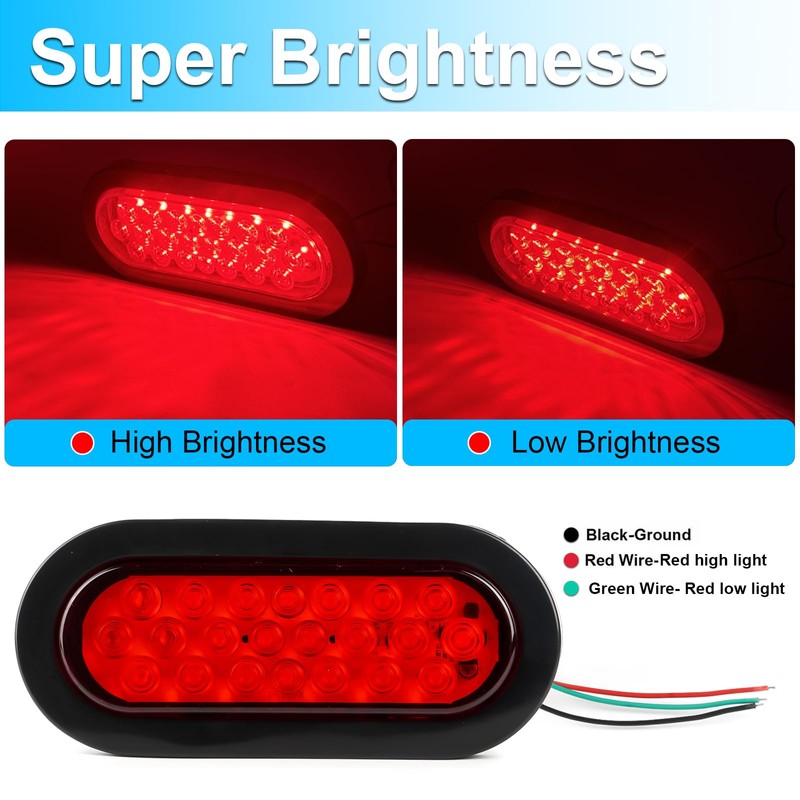 - Dual mode lighting: 6” oval led red trailer lights featuring high and low brightness modes. High brightness for stop/brake lights and turn signals, low brightness for tail lights