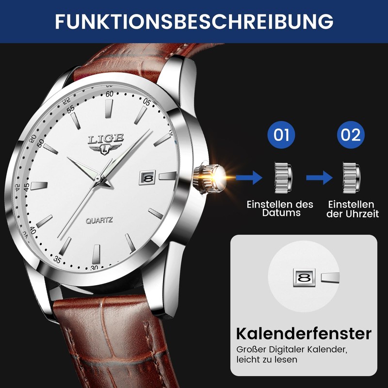 The LIGE men's watch is made of durable stainless steel, which is not only corrosion resistant, but also extremely durable. The high-strength mineral glass protects the dial from scratches and ensures clear visibility of the hands and indices. The genuine leather strap, which is available in different colours, offers not only a high level of comfort, but also an excellent fit that adapts perfectly to the wrist. This combination of high-quality materials makes the LIGE watch a durable and stylish accessory.