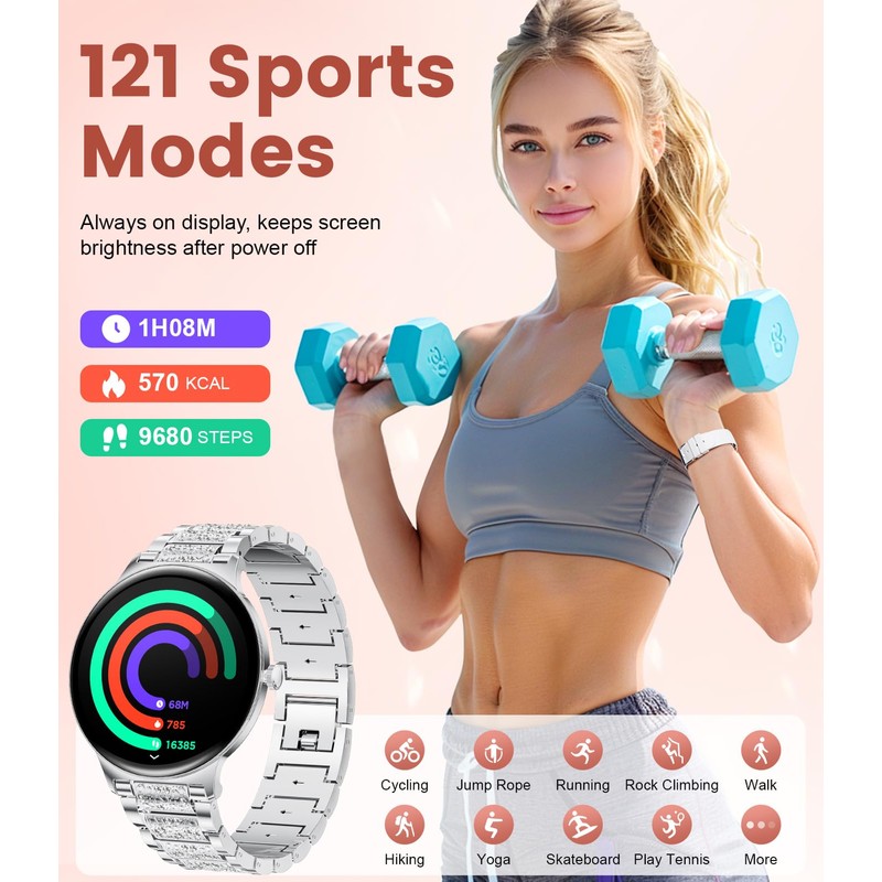 - 【Sleek & Luxurious Design】This Ultra-thin (7.9mm thin), lightweight smart watches for women is designed with ergonomics for maximum comfort. It’s the perfect accessory for women who value both style and functionality, whether during workouts or everyday activities. The stunning diamond-studded metal band adds a luxurious, jewelry-like feel—far beyond ordinary silicone or mesh straps. Sparkling with every movement, it transforms your smartwatch into a statement piece, perfect for both casual and formal occasions. Elevate your style effortlessly while enjoying cutting-edge technology at your fingertips.