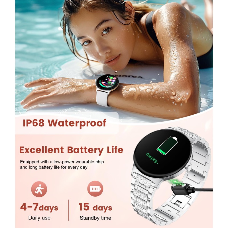 - 【Bluetooth Calling & Smart Notifications】: Enjoy seamless connectivity wherever you go with this smart watches women. Answer calls directly from your wrist or make calls – ensuring you never miss an important moment, even when your hands are full. Stay up-to-date with real-time notifications from your favorite apps, including social media, text messages, and reminders. Whether at work, exercising, or on the go, this watch keeps you connected, informed, and always in control – the perfect blend of technology and comfort.