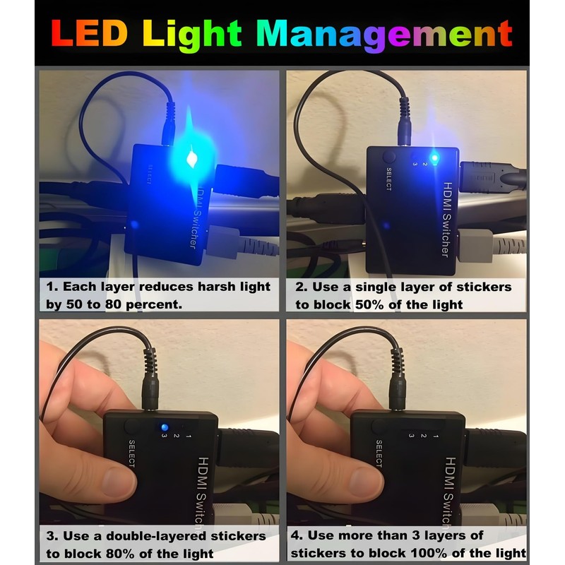 - Visualize Adjustments: The light-blocking sticker has excellent light-filtering ability. It can effectively blocking the diffusion or scattering of light sources while maintaining a certain degree of visibility. It not only reduces the irritation of strong light but also allows you to know whether the device is turned on and working properly. Whether it is bright glare or soft light, it can fully play the role of dimming. It is an ideal choice for bedrooms, nurseries and other places.