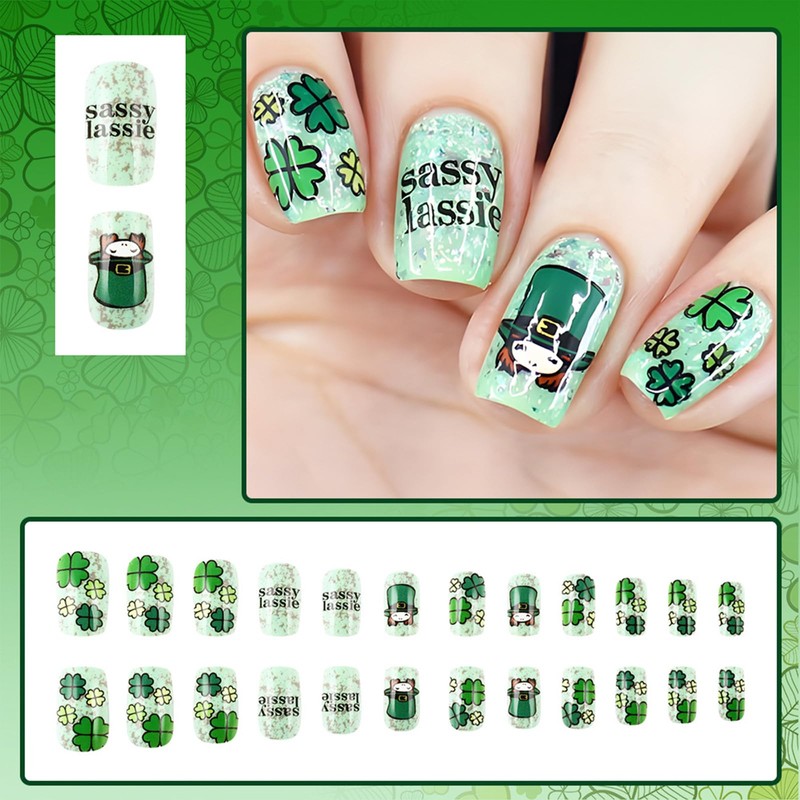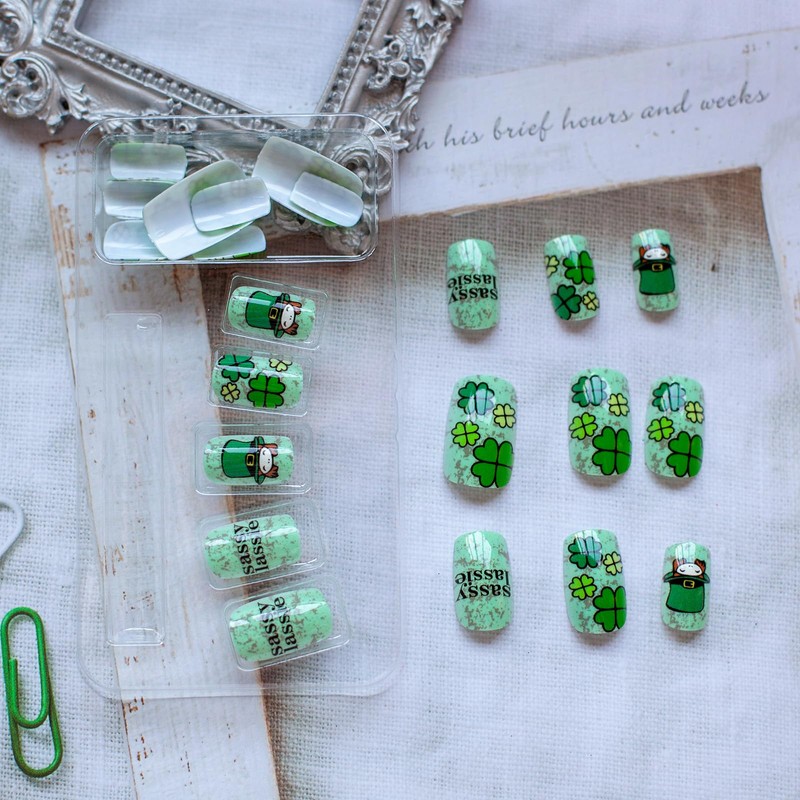 - 【Stylish Design】: Elevate your St. Patrick's Day look with our short and medium square press-on nails, featuring a fun and sassy lassie four-leaf clover lucky pattern design. The glossy light green acrylic adds a playful touch, making these nails the perfect accessory for any festive celebration or casual outing