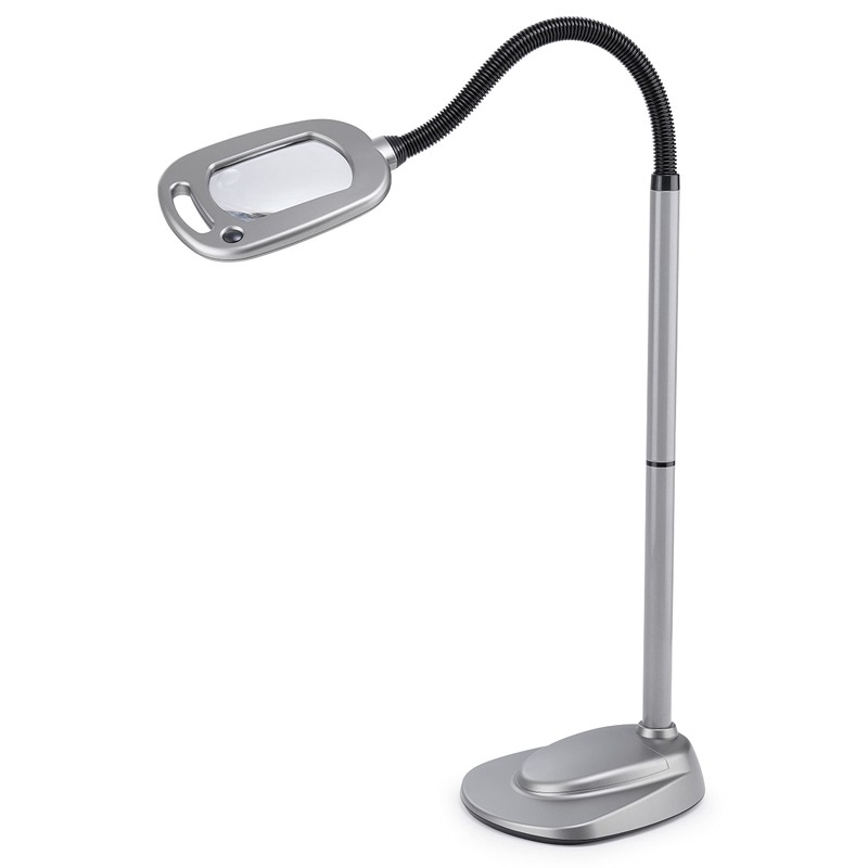 **Adjustable, Glare-Free Illumination** The lamp has a stable, stationary base with a durable metal gooseneck, so you can position the light exactly where you need it--at a table, desk, workbench, or your favorite chair -- and keep it there. The large 5-inch lens has 2x magnification power with 12 glare-free LEDs, so you can easily read a book or newspaper, or view your entire task area. You can also use the 6x loupe inset for reading fine print or closely scrutinizing an object.