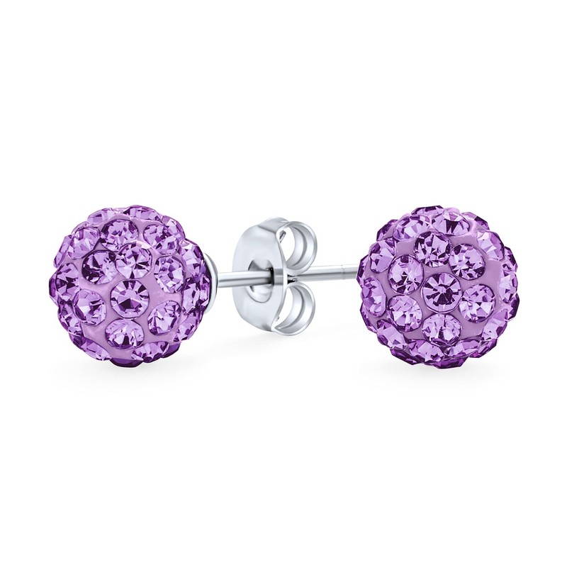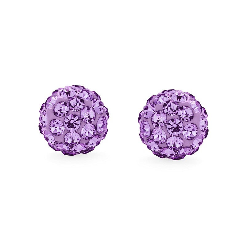 - LIVELY COLOR - Make a bold statement with these stunning disco ball simulated Amethyst studs. Crafted with sterling silver and adorned with sparkling crystals, these earrings are a vibrant burst of color. Perfect for those born in February, they make a thoughtful gift for anyone with pierced ears.