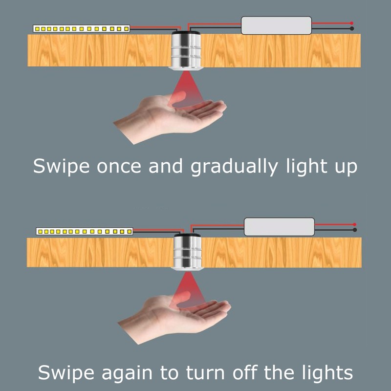 1、Infrared Hand Scanning Switch: The light is gradually turned on by hand sweeping once, and then turned off after sweeping. The operation is convenient and simple, and the intelligent life is realized. 2、Material: Aluminum alloy shell, strong and wear resistant, not easy to heat, long service life. 3、Space Saving: Portable, compact, flush mounted, does not take up cabinet space. 4、Low Voltage: for Dupond male bus, DC5‑24V low voltage power supply, safe and stable. 5、Infrared Motion Sensor: When it detects human motion, it will switch directly to the connected indicator.