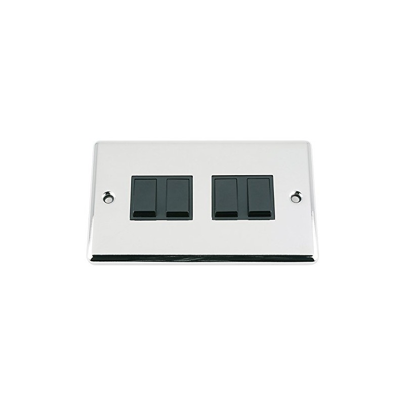 Light Switch 4 Gang - Polished Chrome - Classic - Black Insert Plastic Switch - 10 Amp Quad 4 Gang 2 Way