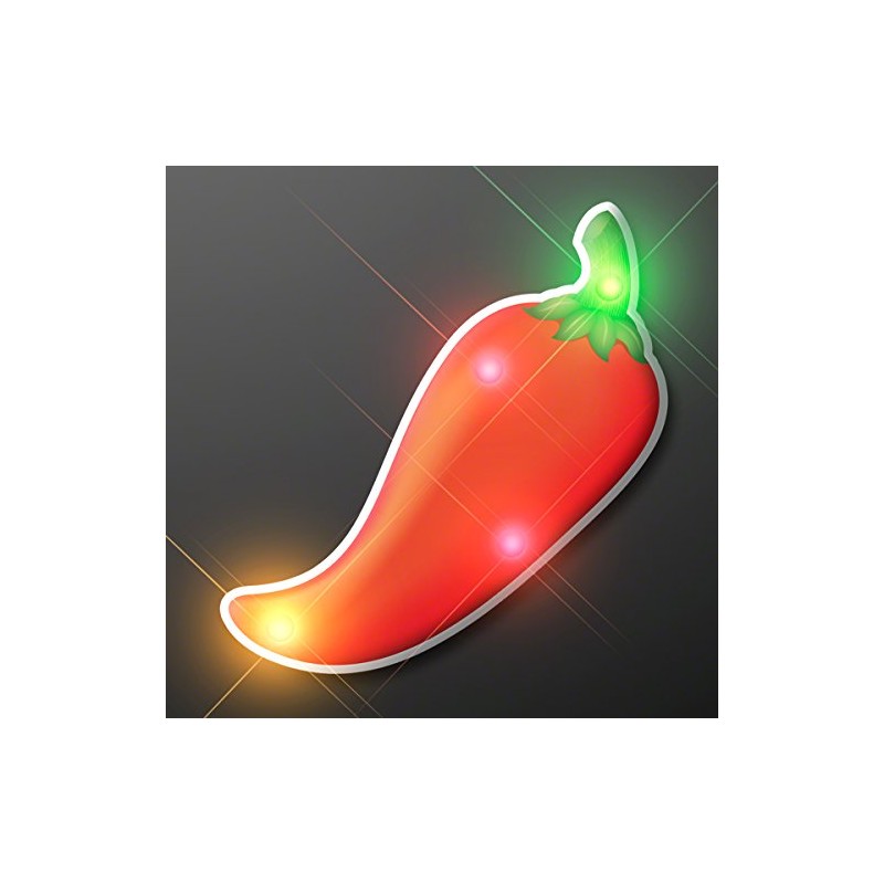LED Chili Pepper Blinky Light Pins are hot, hot, hot! Complete with 4 bright LED lights and a safety pin to attach to wherever, Red Chili Body Lights are the perfect party goods for Cinco de Mayo, summer festivals & events, plus whatever else your chili-lovin' brain can imagine. Register high on the pepper hotness scale with Light Up Red Pepper Lapel Pins. To activate Chili Pepper LED Lapel Pins, remove pull tab & press button on back for 1 function: Flashing. Pieces include safety pin backing. LED Colors: 3 Red, 1 Green. Dimensions (W x H): 2.25" x 1". LED Chili Pepper Blinky Light Pins include 2 CR927 Batteries. Batteries are replaceable.