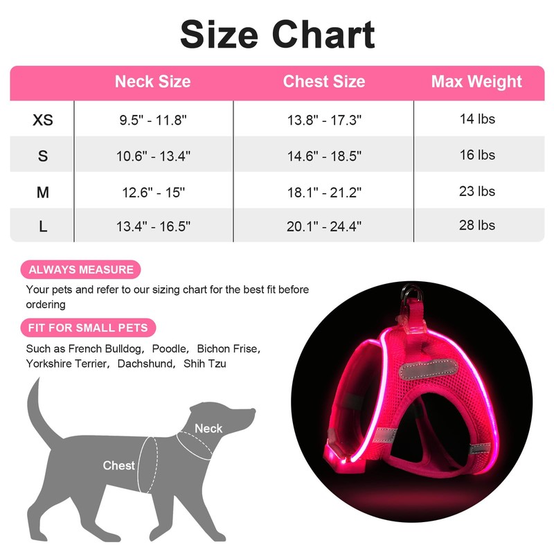 - 【Fits for Small Size Pets】Our light up dog harness for small medium large sized dog is fully adjustable, perfect for all types of small pets, such as French Bulldog,Poodle,Bichon Frise,Yorkshire Terrier,Teddies,Dachshunds,Shih Tzu and other small dogs.
