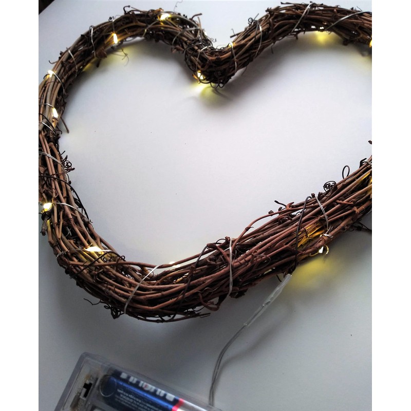 This large 12 inch lighted heart wreath is handmade from dried natural grapevine then accented all around the heart with yellow LED lights. Also known as fairy lights. It creates a stunning impression once you press the switch.