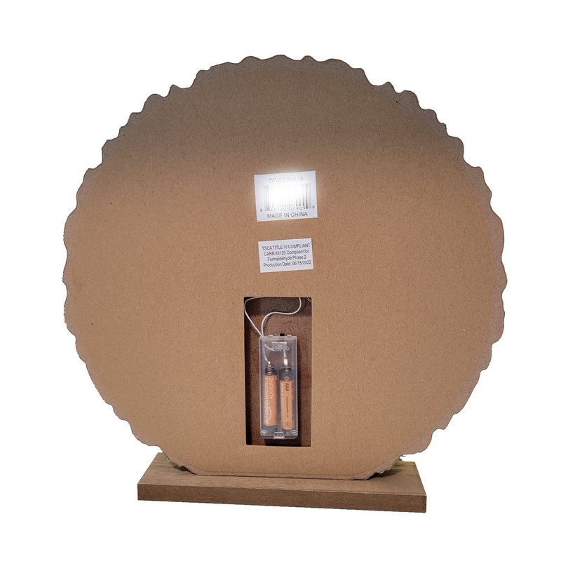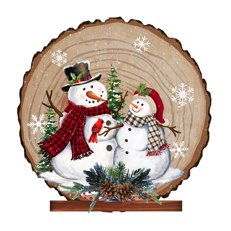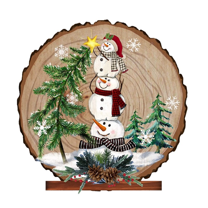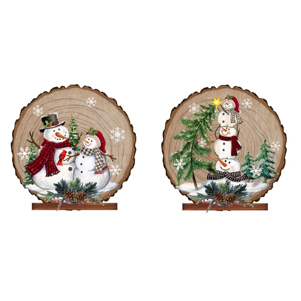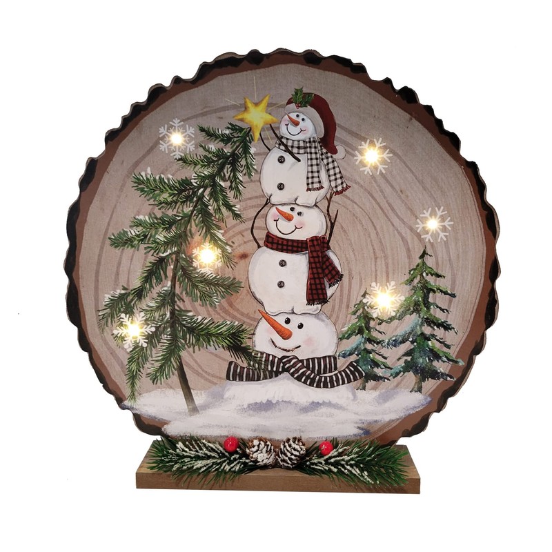 - Set of 2 wooden wall art pieces with painted snowmen, Christmas trees and lighted snowflakes. The tabletop ornaments are made to resemble slices of trees.