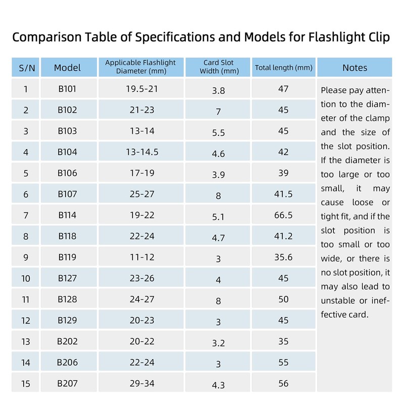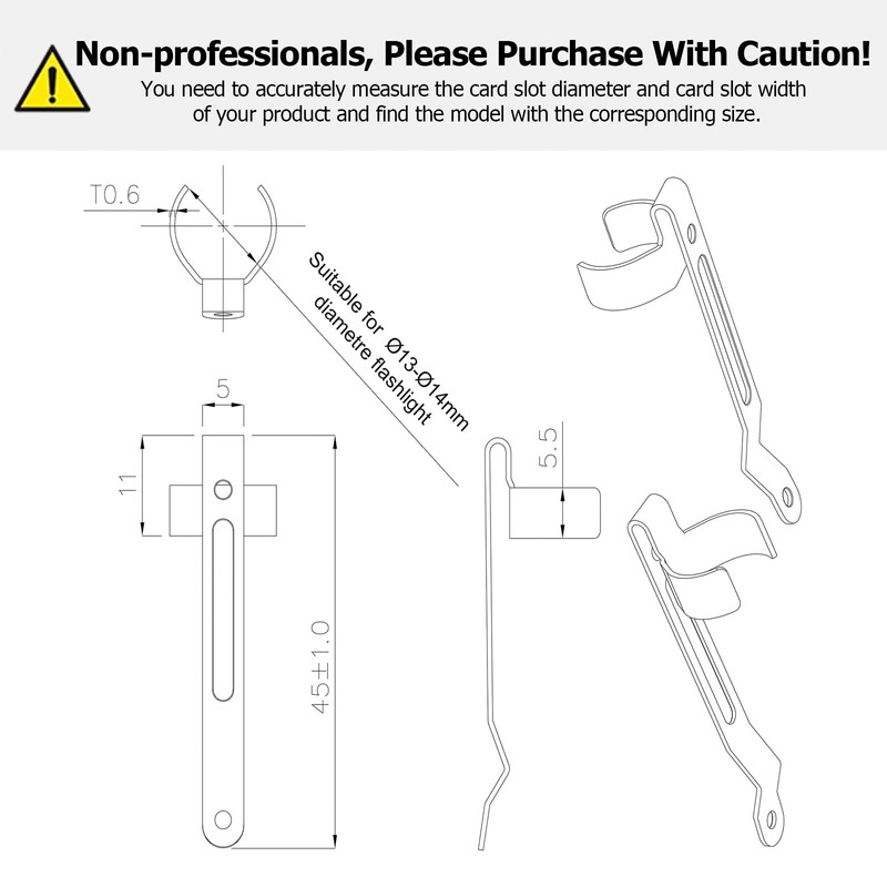 1.It is easy to install and disassemble on a flashlight. Put it in your pocket to become a pocket clip,< br > or clip it onto a hat to become a hat clip. < br >Free your hands during work and reduce the trouble of finding flashlights everywhere.< br > < br > 2.Widely used. Clips are suitable for flashlights, pen lights, pen stationery, < br >or other items or tools of the same size.< br > < br > 3.The design of the pen holder is very diverse and full of fashion sense. 16 clip types for you to choose from, < br >suitable for most flashlights on the market. Please refer to the dimensions in the figure.< br > < br > 4.Kind reminder: Please choose a flashlight clip of appropriate size, and be careful not to scratch the flashlight and your body during installation. < br >Too large or too small, or the installation slot size is incorrect, may cause you to fail the installation and waste your time.< br >