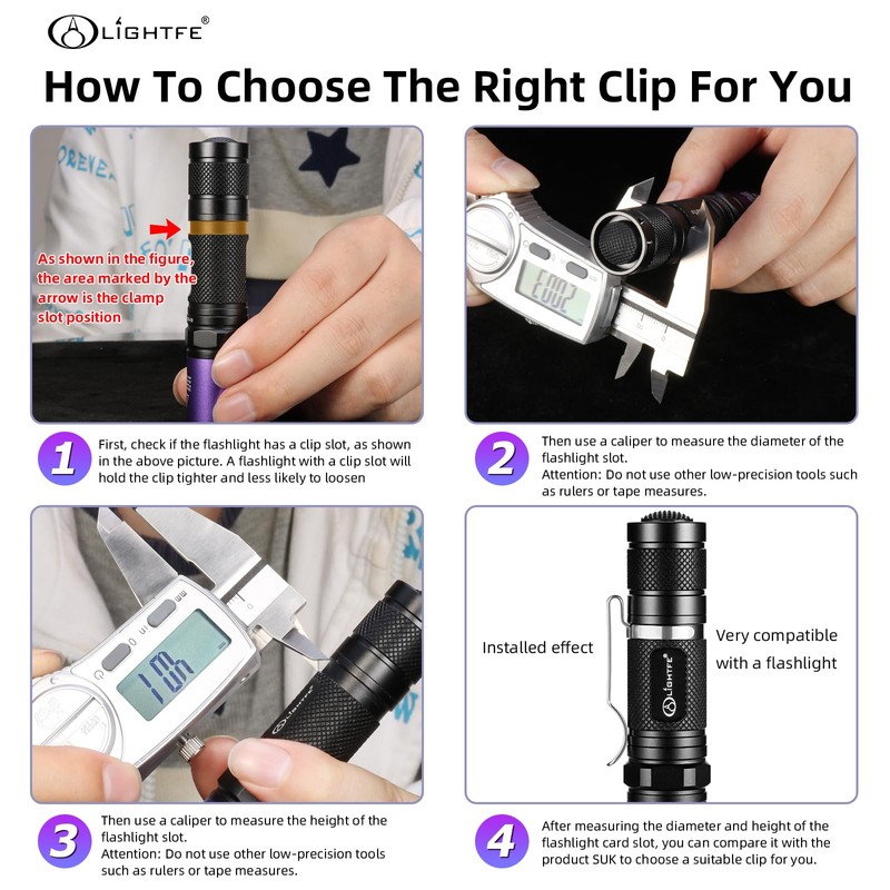 • 4.Kind reminder: Please choose a flashlight clip of appropriate size, and be careful not to scratch the flashlight and your body during installation. Too large or too small, or the installation slot size is incorrect, may cause you to fail the installation and waste your time