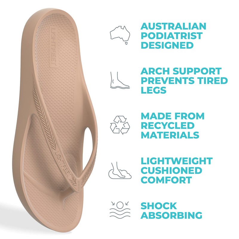 - LIGHT FEET THONGS ARE DESIGNED BY AUSTRALIAN PODIATRISTS - The high arch support aids common overuse conditions like flat feet & plantar fasciitis. The deep heel cup supports your heel, ankle and foot for maximum efficiency. The result is the most comfortable flip flop you’ve ever worn!