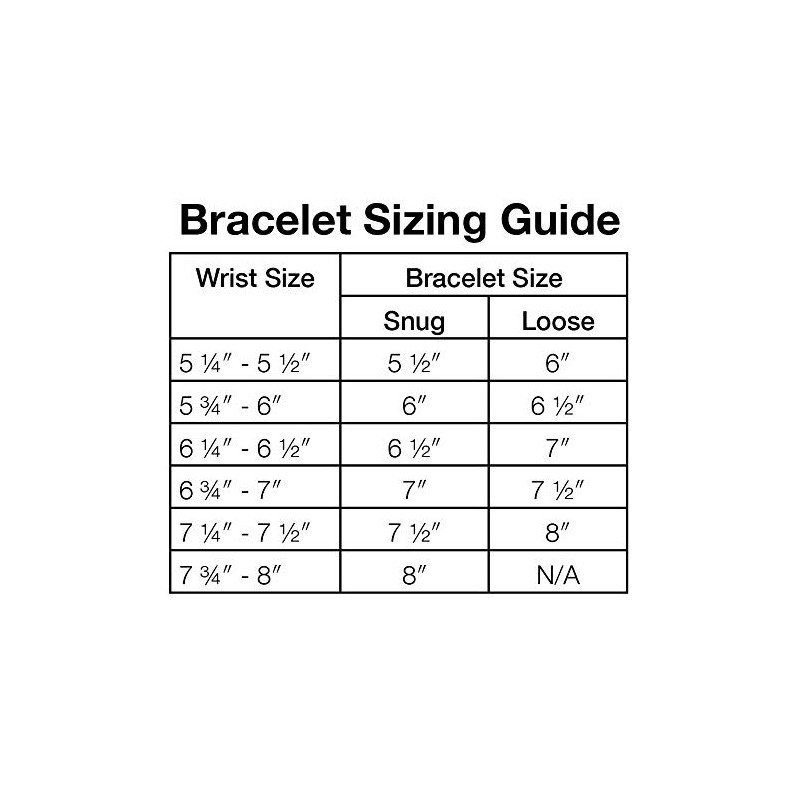• This bracelet has a circumference of 7 1/2 inches. It is available in multiple sizes. To measure your wrist, take a string and wrap it around your wrist. Lay the string down next to a ruler to determine your wrist's circumference. Consult the chart pictured to the left to determine which size will be best for you.