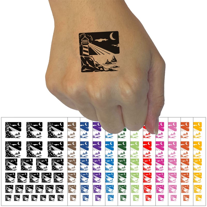 Lighthouse On the Ocean Under Night Sky Temporary Tattoo Water Resistant Fake Body Art Set Collection - Brown (One Sheet)