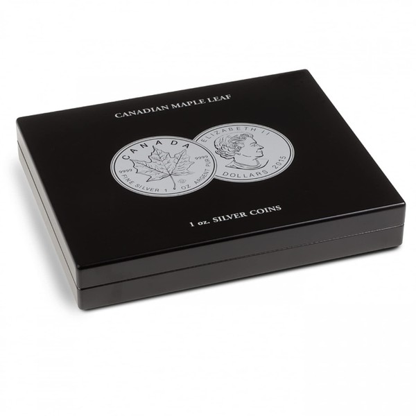 Introduced by the Royal Canadian Mint in 1988, the 1 oz. Maple Leaf silver dollars have become one of the most recognizable and popular bullion coins. In addition to the annual bullion strikes, a number of special commemorative editions have been minted. Elegant presentation case for 1 oz. Maple Leaf silver dollars in LIGHTHOUSE CAPS38 coin capsules* (not included). One tray covered in black velour with 20 spaces. Black satin lid cushion and secure magnetic closure.  Maple Leaf design is printed in silver on the lid and inside cushion.  Additional tray to hold another 20 Canadian Maple Leafs may be purchased separately and will fit into box (Ref. No. HMKEINL20CAPS38). Note: The other coin capsules that the American Silver Eagle special editions are sold in may not fit ! Diameter of slots is 44mm.