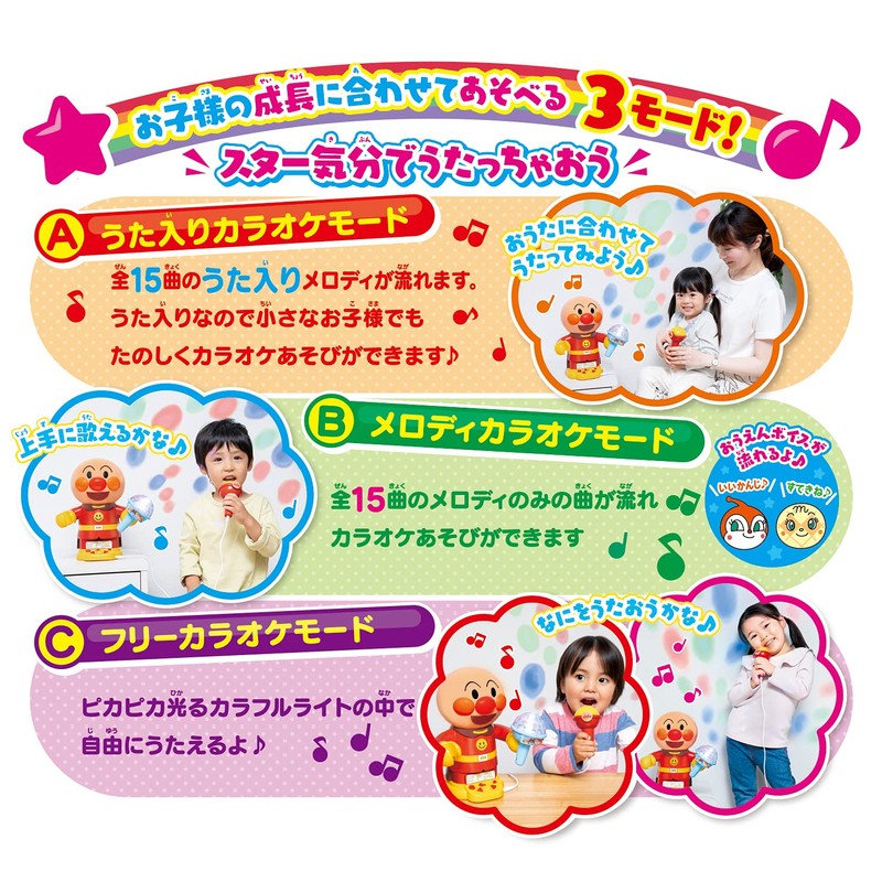 - With bright and colorful lights you can play karaoke with Anpanman at home. In addition to Anpanman March and Sunsun-Ito, it includes 15 songs including your child's favorite nursery rhyme