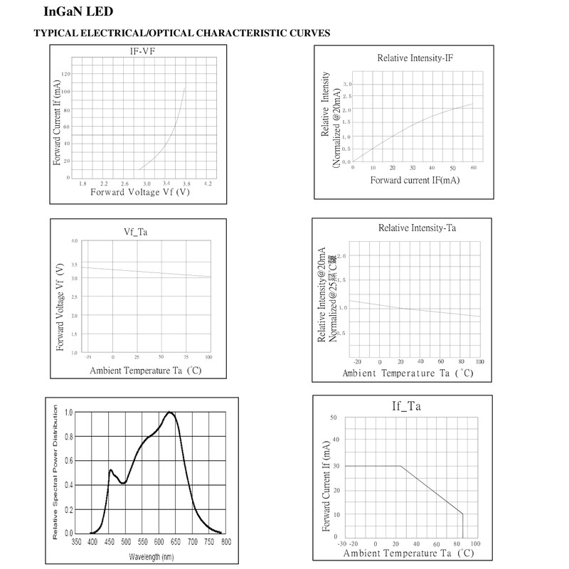 • Standard current: 20 mA / Forward voltage drop: 2.9 - 3.6 V / Luminous Intensity: 4200 - 5800 mcd / Half angle: 15 degree