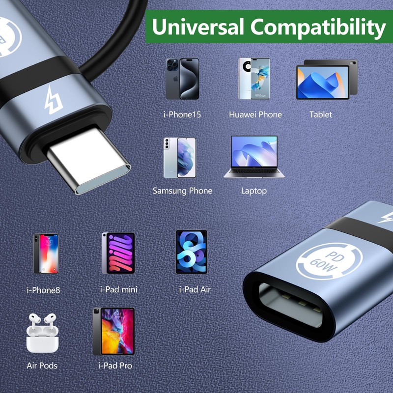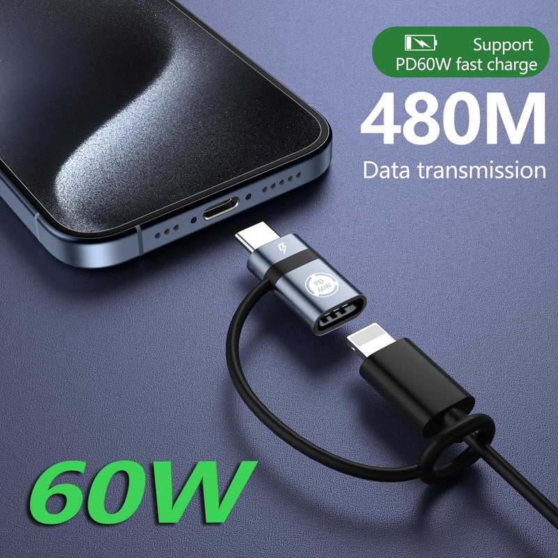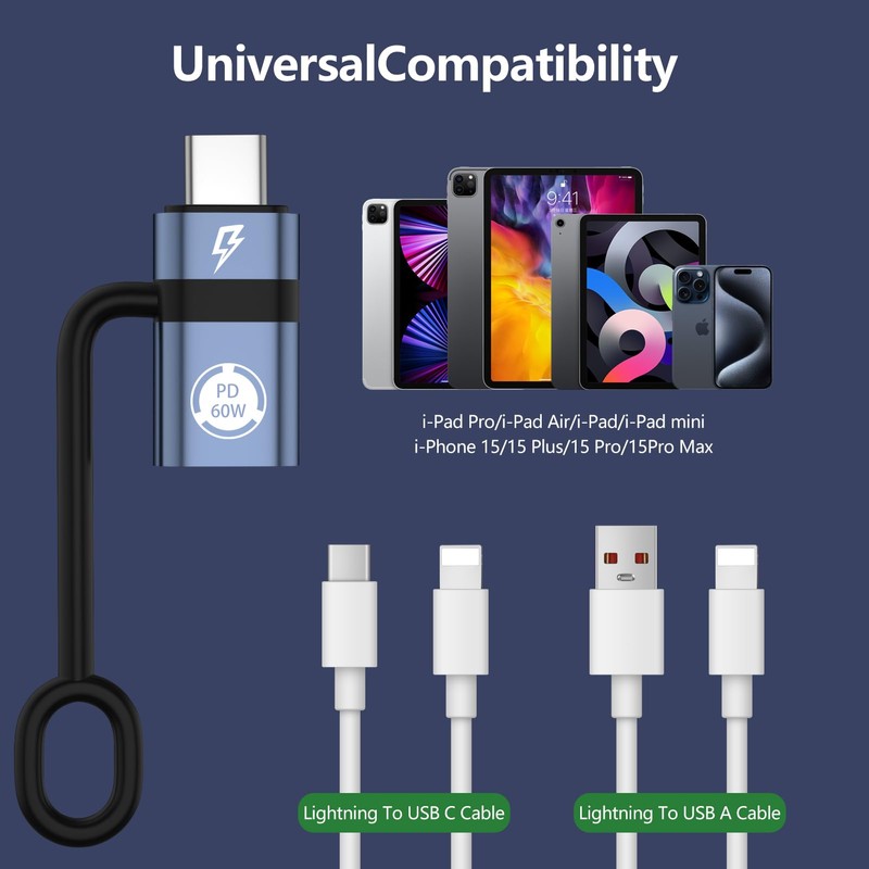 - [Lightning to USB C adapter]: Supports 60W fast charging converter and data transfer, with a data transfer speed of 480Mbps. It is used together with the Lightning interface cable. Compatible with PD, QC, and standard fast charging and data transmission.