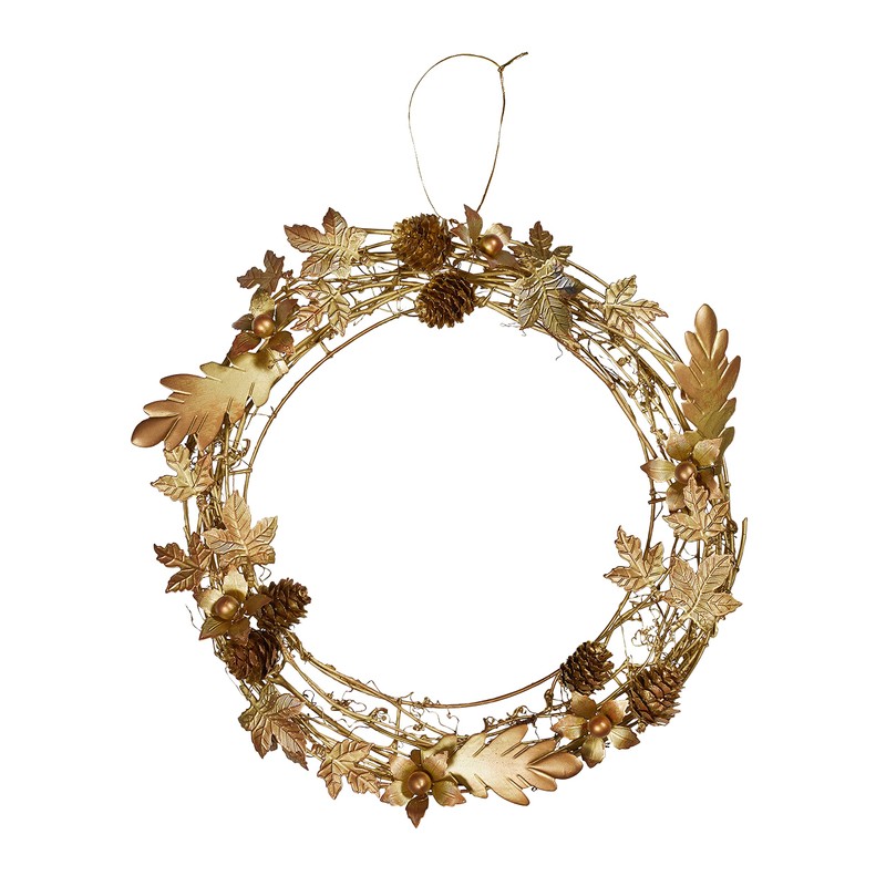 The golden wreath is equipped with different types of autumn leaves and pine cones.