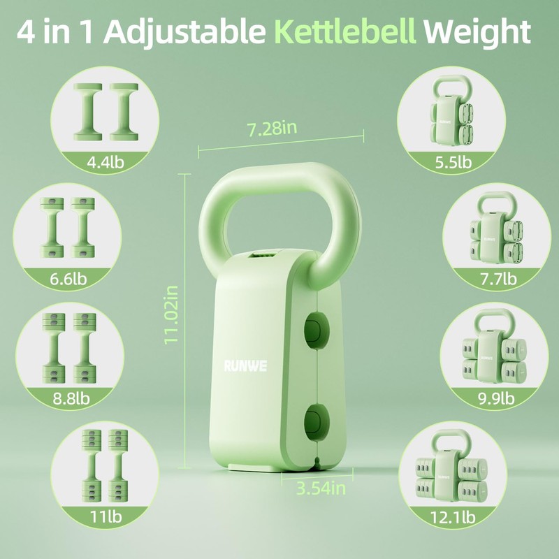 - 4 in 1 Adjustable Weight: Each dumbbell component adjusts between 2.2lb, 3.3lb, 4.4lb and 5.5lb (11lb total combined weight). The kettlebell converter weights 1.1lb(0.5kg), each dumbbell plate weights 0.55lb(0.25kg). Kettlebell weight adjustable from 5.5lb to 12.1lb, ideal for travel exercise, progressive training, and busy lifestyles. No tools needed!