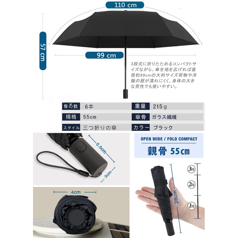 Lightweight Compact One-Touch Automatic Open and Close Folding Umbrella, Men's: 215g 21.7 oz (55 cm), 6 Ribs, 3 Tiers - No Popping Out in the Middle Safe, Black, Gift Boxed, 65403BK, black-1