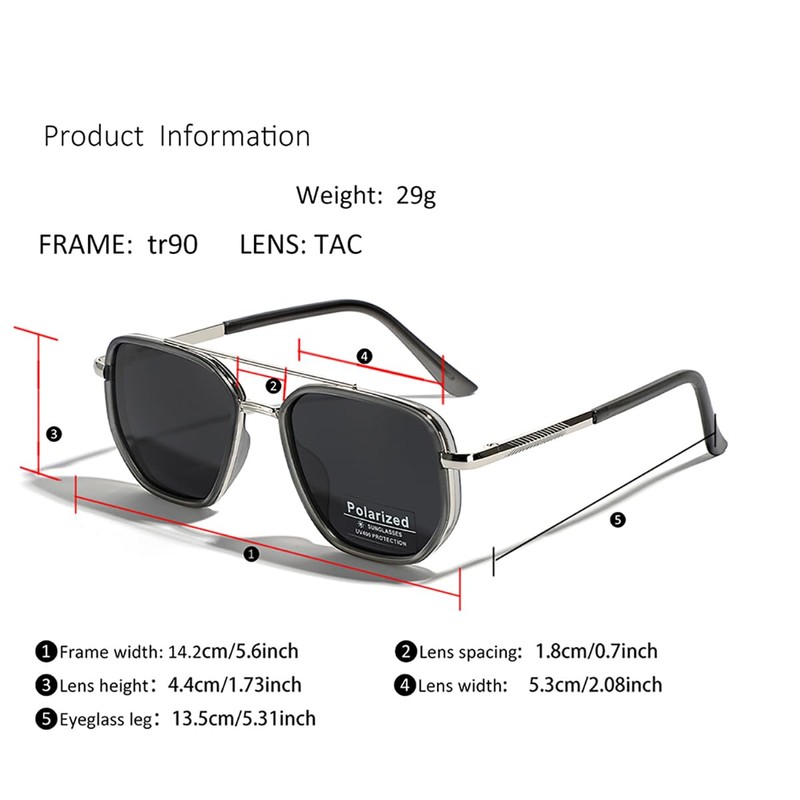 Product Description: Vintage TR90 Polarized Sunglasses R etro Square Sun shades Why Choose Kachawoo Sunglasses? Kachawoo Sunglasses, Only FOCUS ON INNOVATION, QUALITY AND SERVICE We Create more than 10 NEW DESIGN each Month! Details: Flattop Frame Big Sunglasses Luxury designer TR90 eye wears Polarized Protection lenssun shades Gender: male female unisex Lens: Lens material: Resin & polarized REVO lens. Revo lenses are scratch and impact resistant, with perfect clarity of vision P olarized UV400 PROTECTION: harmful UV rays are blocked, only useful visible rays enter your eyes Dimentions: Frame total:1 42 mm Lens height: 44 mm Lens width: 53 mm Bridge: 18 mm Package includes: 1*Glasses 1*Glasses cloth 1*Glasses pouch