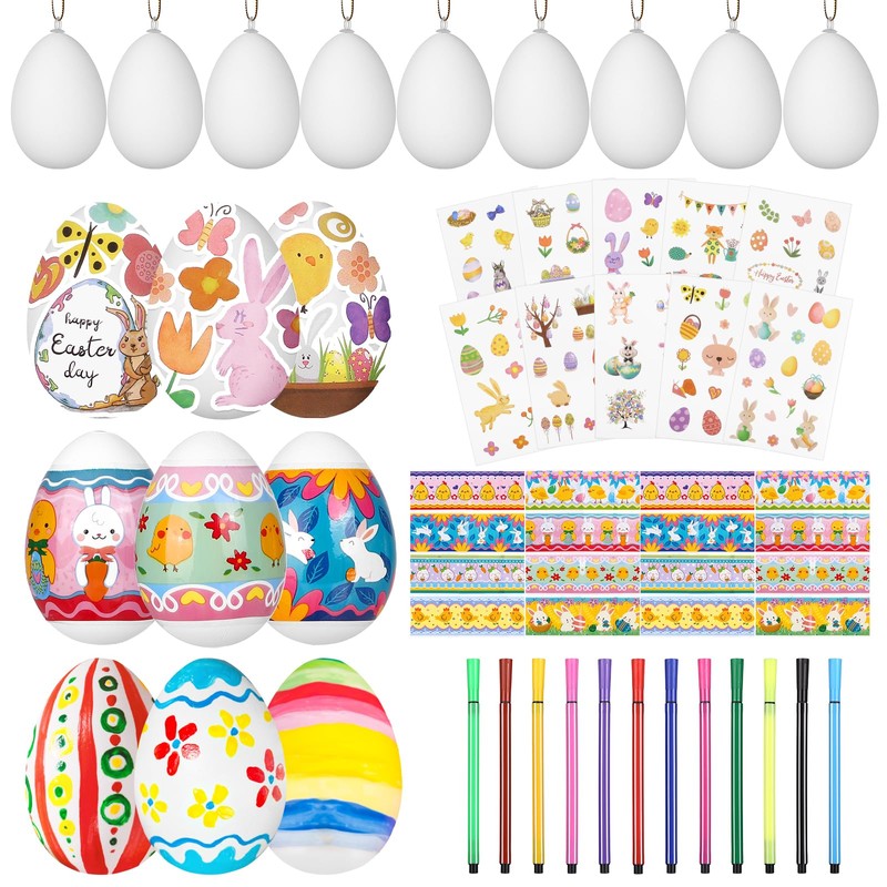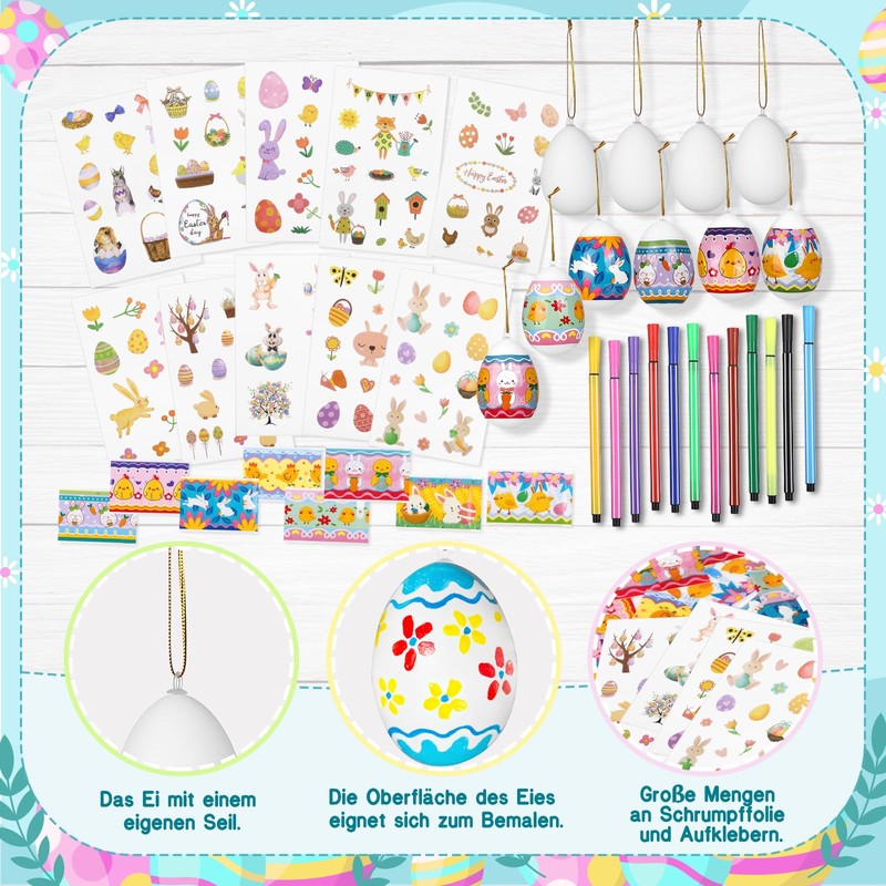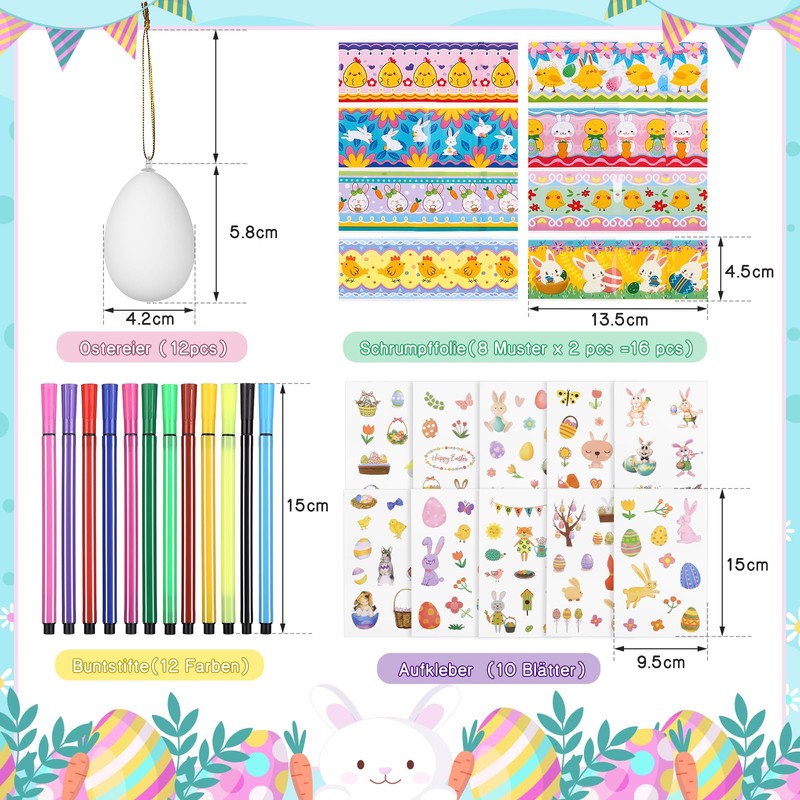 - Colourful Easter eggs set: 12 white Easter eggs to paint + 12 coloured pens + 10 stickers + 10 shrink film. Enjoy a fun craft time with your kids. Then create fun personal Easter eggs.