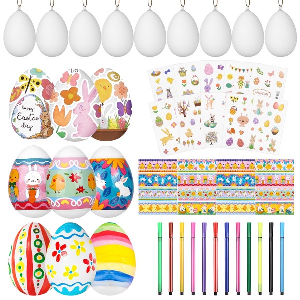 LIHAO Pack of 12 Easter Eggs for Painting White Eggs Hanging Easter Decoration with Shrink Film Pens Sticker Easter Egg Colour Crafts
