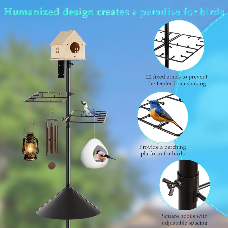 • Decorate your outside backyard: This bird feeder poles for outdoors is not only novel in appearance, but also versatile. It has a fixed bracket for the bird nest on the top, two movable horizontal rectangular hooks, and a baffle to prevent squirrels. Such a rich combination will hopefully make your garden more vibrant and attract more birds.