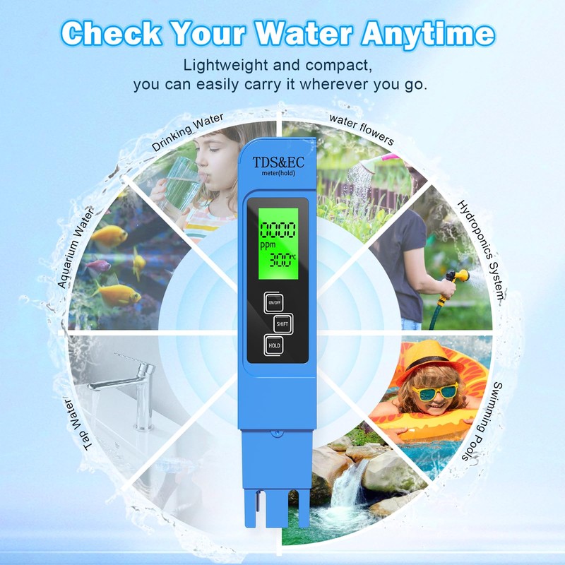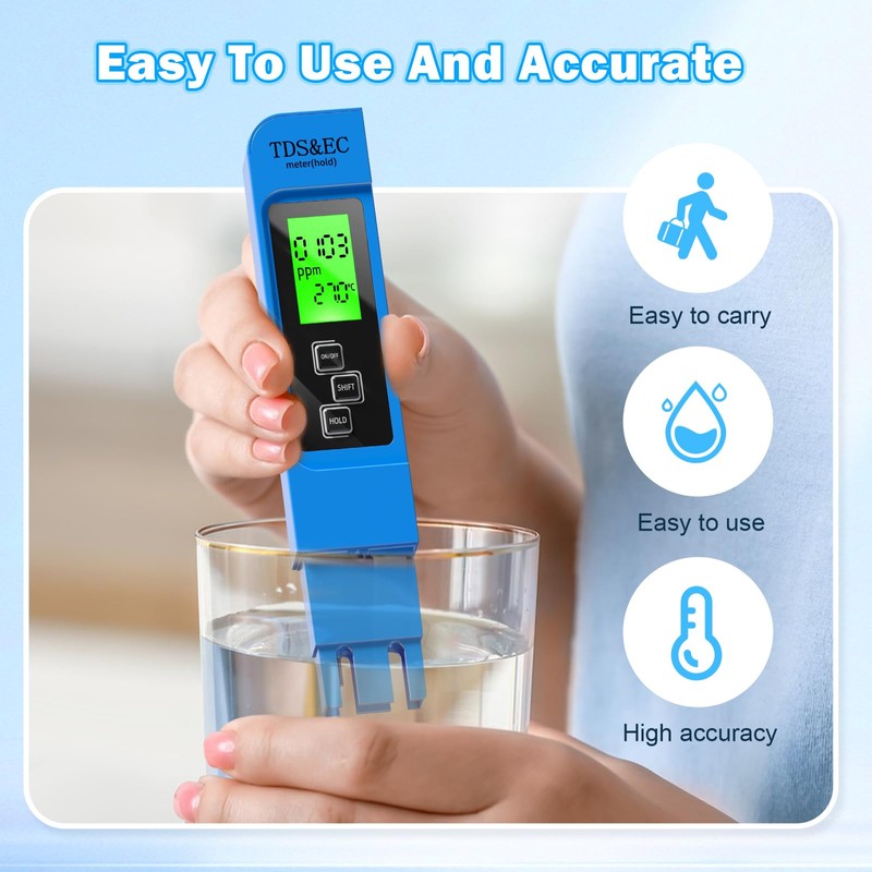 - MULTIFUNCTIONAL (4 IN 1) & 5 UPGRADED 4 in 1 TDS Meter, Electric Conductivity Meter & Temperature (C,F)Meter features the most updated technology.Upgraded with big backlit LCD for easier reading, auto-lock function for easier use, factory calibrated and hold function for direct use and auto-0ff in 2 minutes to conserve battery. These enhancements make it a user-friendly tds meter digital water tester for a variety of applications