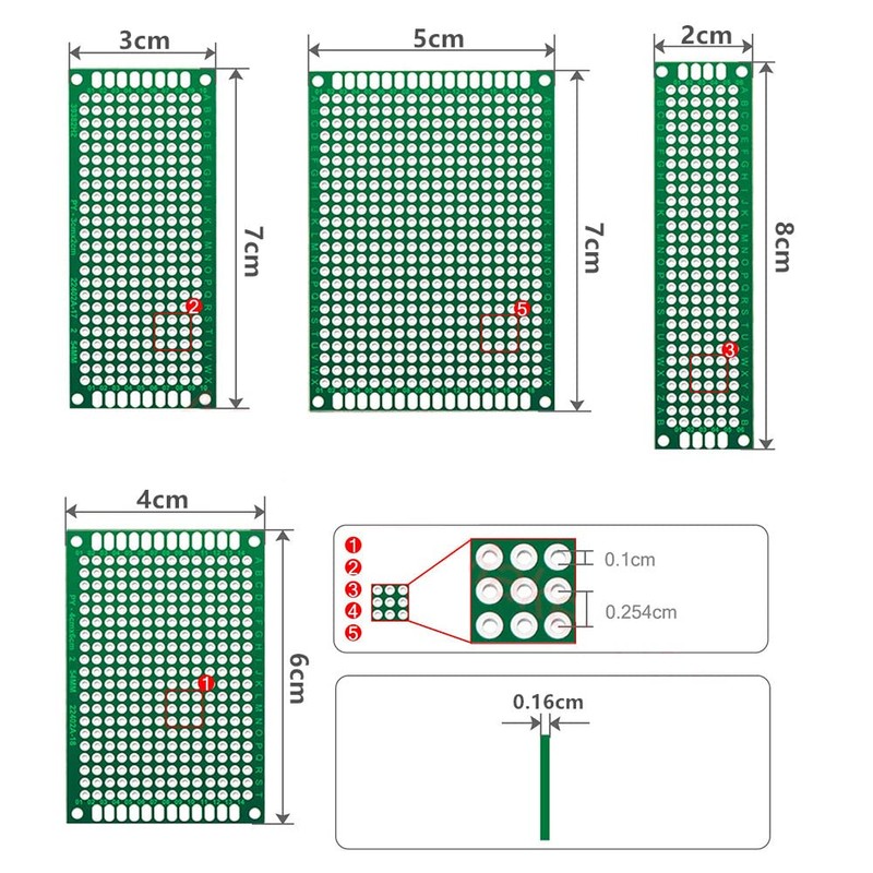 - 4 Sizes: 0.8 x 3.1 inches (2 x 8 cm), 1.6 x 2.8 inches (3 x 7 cm), 1.6 x 2.8 inches (4 x 6 cm), 2.8 x 2.8 inches (5 x 7 cm), 5 pieces (20 pieces) Material: FR-4 (fibergIt is a very sturdy and durable circuit board with excellent insulation and heat resistance