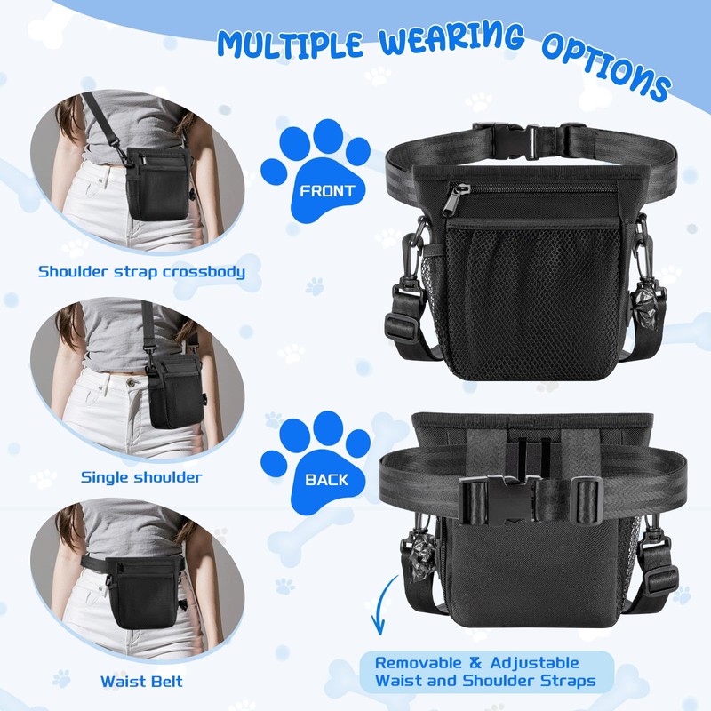 - 【Multiple Ways to Wear】Wear the dog snack pouch as a dog fanny pack with the adjustable 51" waist belt, clip it on with the metal clip, or use the 52" shoulder strap to carry it crossbody or over the shoulder. No matter how you wear it, you’ll have quick access to treats while staying focused on training and bonding with your pet