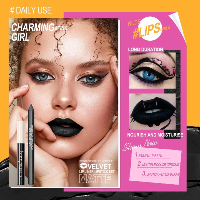- Versatile: ingredients such as vitamin E, beeswax and plant oils achieve a long-lasting moisture effect and a light texture. Ying, non-stick cup and non-fading lipstick accentuate your beauty, create an adorable makeup that is easy to use. From daily makeup for work to Halloween, cosplay, gothic, rock or avant-garde style, this set of long-lasting eye shadow pencil lipstick can be perfectly combined