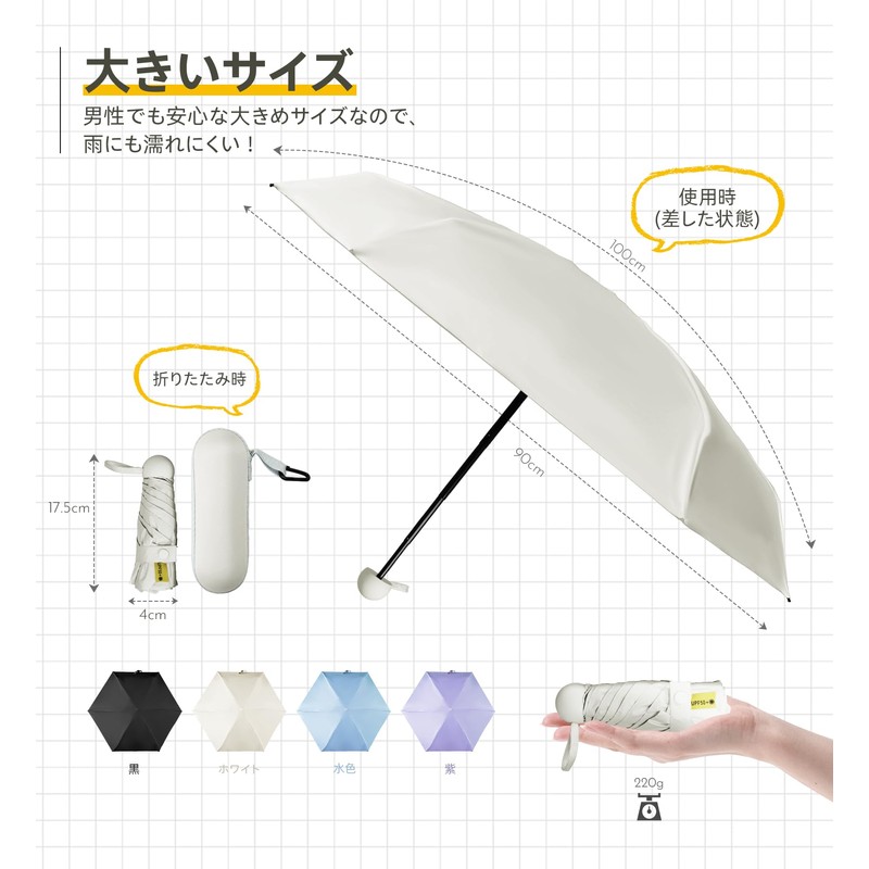 • Ultra Lightweight and Compact with Hooks: The folding parasol has a compact design, and the size is slightly 6.9 x 1.6 inches (17.5 x 4 cm), and weighs 7.5 - 7.8 oz (215 - 220 g). It can be stored smoothly in the included storage case even when you don't have time to fold it up. The storage case is designed with a hook, so it can be used for a wide range of occasions such as commuting to school, work, excursions, travel, business trips, etc