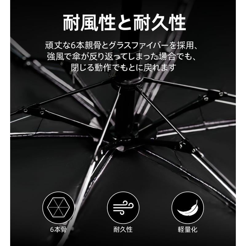 • Wind Resistant & Durable: This folding umbrella is made with 6 sturdy ribs for improved wind resistance and durability. Made of fiberglass so that even if the umbrella bounces back in strong winds, it can return to the closed motion