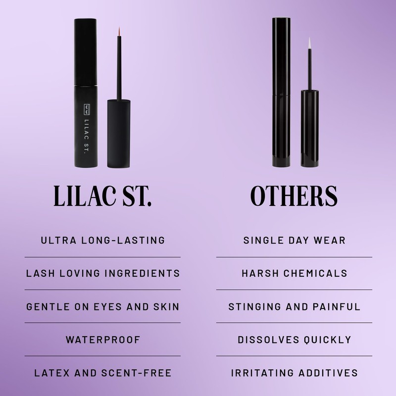 - Lilac Lash Glue - The perfect bond for beginners with a strong yet forgiving formula with plenty of playtime for wisp placement. The brush tip applicator makes precise application a breeze. Dries black for an eyeliner-like look.