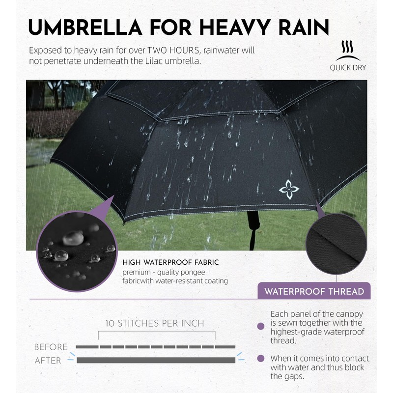 - 【UMBRELLAS FOR RAIN】We utilize high-quality pongee fabric with water-resistant coating, enabling rapid drying within minutes.Each panel of the canopy is sewn together with the highest-grade waterproof thread, with up to 10 stitches per inch. This meticulous construction ensures that even when exposed to heavy rain for over 1 hour, rainwater will not penetrate underneath the Lilac umbrella.