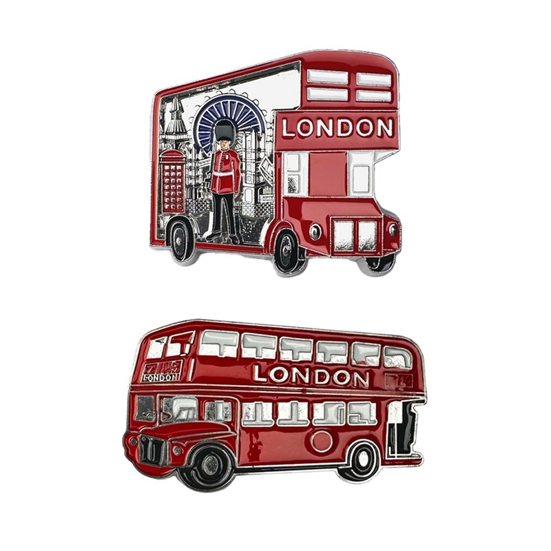 - Set of 6 metal magnets featuring iconic London landmarks: Big Ben, Tower Bridge, London Eye, Red Phone Box, Double-Decker Bus, Royal Guard, and London skyline